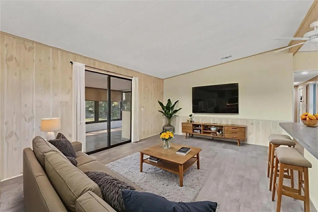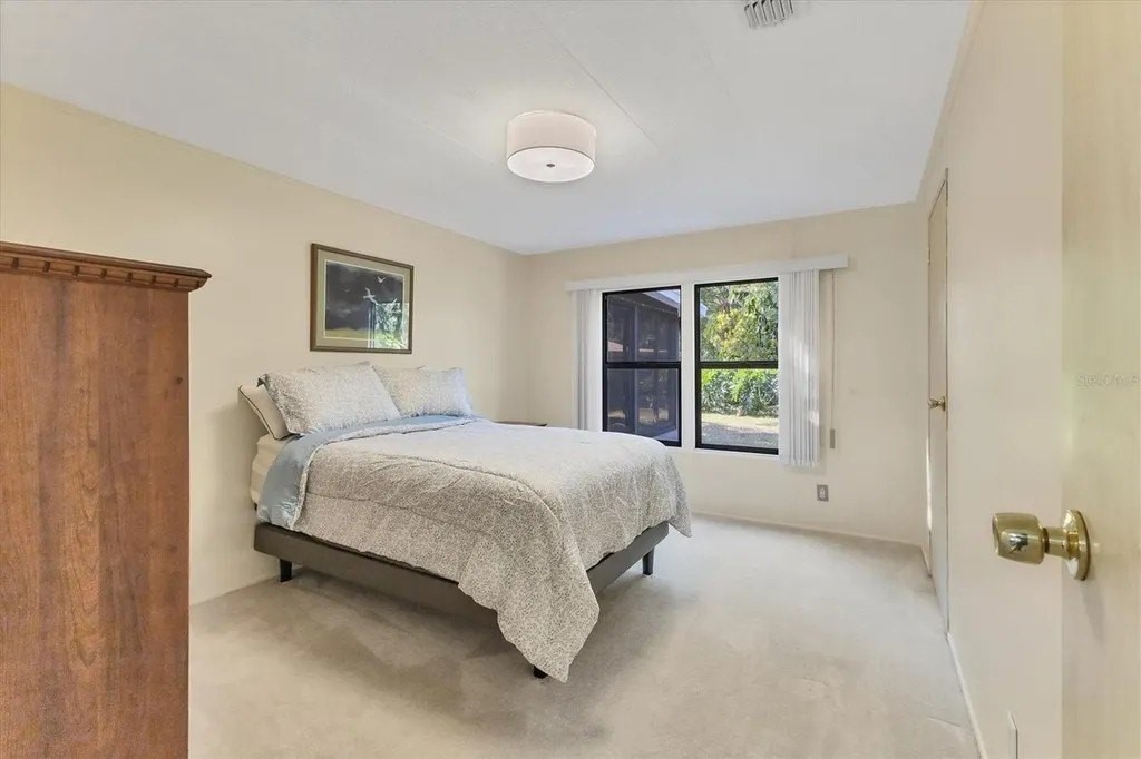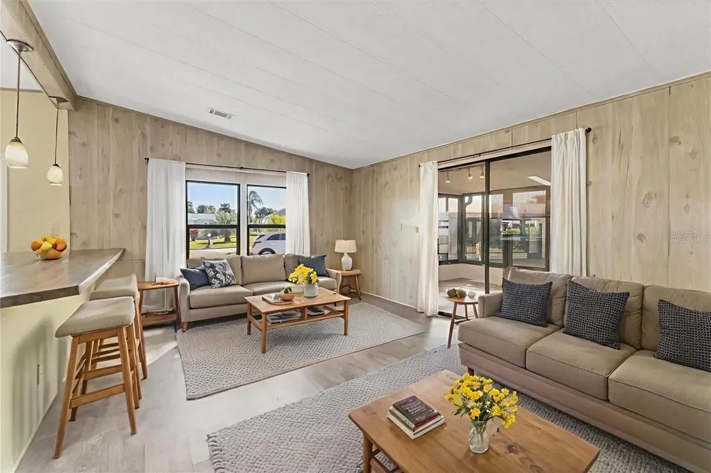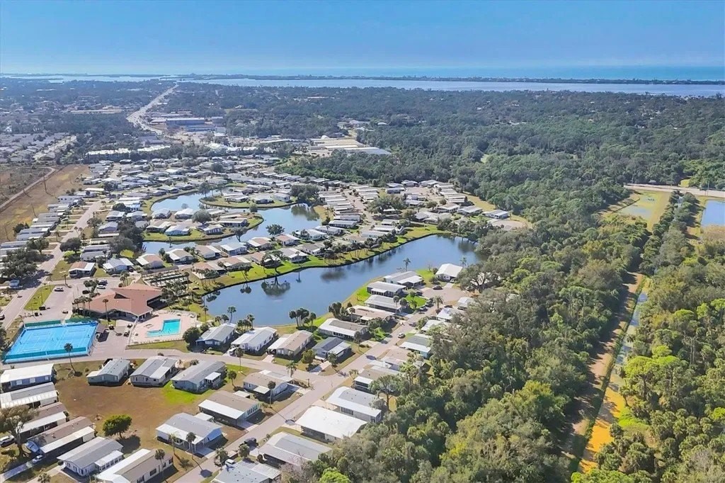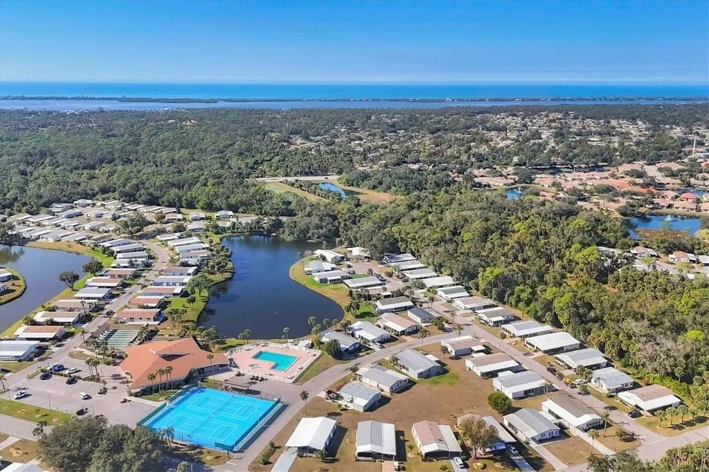A uniquely private location on a cul-de-sac, with a private backyard, boasting a greenbelt area, not to be built on, that is lush and green! This highly sought-after gated community of Tangerine Woods, is an active and friendly, 55 and over community, where you own both your lot and home. For your leisurely pleasure, this community provides you with a large heated pool and clubhouse, an exercise room and library, tennis and pickleball courts, walking trails, shuffleboard, and so much more! This light and bright, partially furnished home, leaves room for you to select the upgrades that are important to you. A neat and clean home with a brand new roof in 2026, A/C replaced in 2023, and a spacious, chef's delight kitchen, which includes a large breakfast bar, and plenty of counter and cupboard space, is sure to appeal to most as either a permanent home or a seasonal winter getaway from the cold. The master bedroom has 2 large closets and an oversized en suite bathroom. Additionally, there is a bonus room that serves as a versatile flex space for either a home office, hobby room, library or storage. Of the 2 screened and shaded lanais, one offers large sliding windows, with roll down shades, tiled flooring, and a window unit air conditioner for your indoor/outdoor pleasure! The 2nd screened lanai is just perfect for backyard entertaining and those much enjoyed grilled dinners off your private yard. The low monthly HOA payment of $226 includes cable TV, internet and grass cutting, and Tangerine Woods is pet friendly! This community is close to Historic Dearborn St., which provides casual dining, evening entertainment, locally owned shops and a Farmers Market on Thursdays. The local beaches are just 4 miles away, as well as many local golf courses, and world class fishing! Make your appointment today to see this wonderfully located home, as it won't last long!